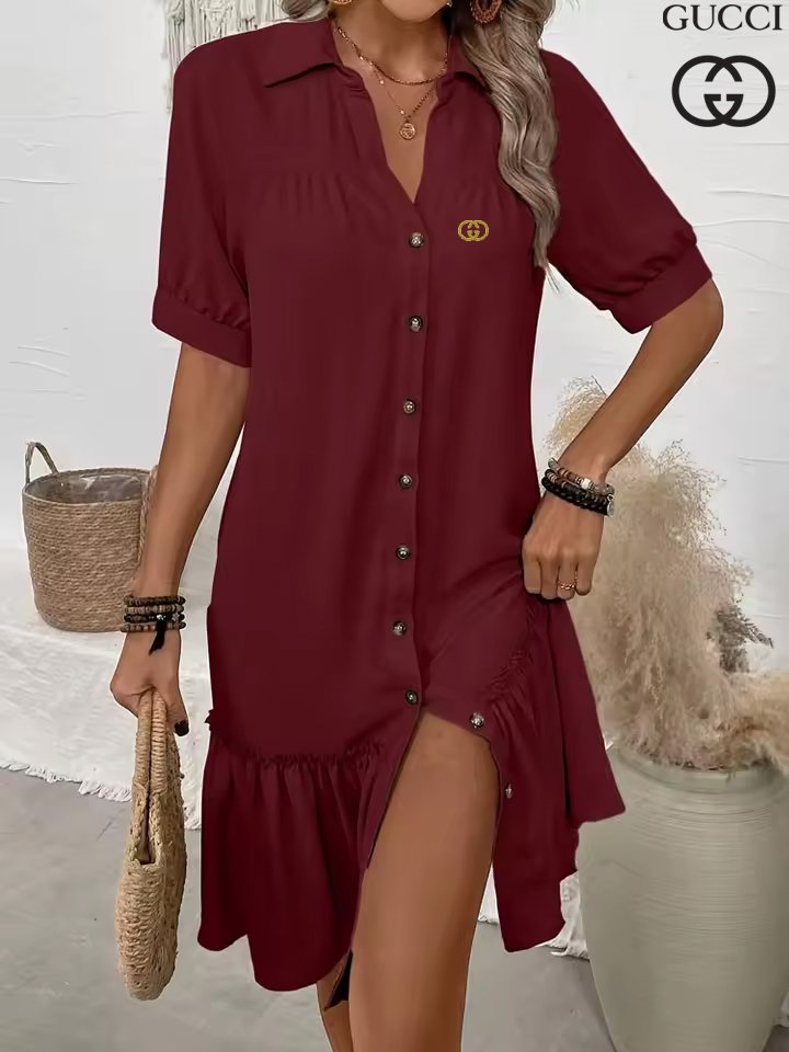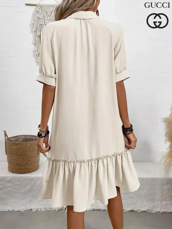 Chic and effortlessly flattering, the Gucci – New Elegant Dress is a must-have for versatile styling. Its A-line silhouette and delicate ruffle hem create a graceful flow, while the button-down front and V-neckline bring subtle elegance. Perfect for dressing up or keeping it casual, this piece makes getting ready feel refreshingly simple.
